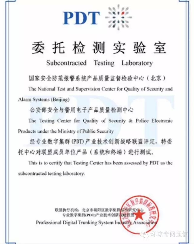 公安部安全与警用电子产品质量检测中心成立于1987年,是公安部检测中心的重要组成部分。在公安部科信局的领导下,经专业数字集群(PDT)产业技术创新战略联盟评定,委托公安部安全与警用电子产品质量检测中心、国家安全防范报警系统产品质量监督检验中心(北京)对联盟成员单位产品(系统和终端)进行测试,以期规范警用数字集群系统和终端的功能技术指标,适应公安行业不同的使用环境和业务需求,解决不同厂家系统和终端兼容性及协议一致性的问题。