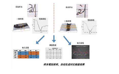 该产品由检验人员根据笔迹检验需求,计算机全程自动化控制,自行确定数据采集范围。检验全程可视化,检验结果数据可采用多种方式展示,涵盖原始图像、趋势图、数据表格、比对结果、相关性等。