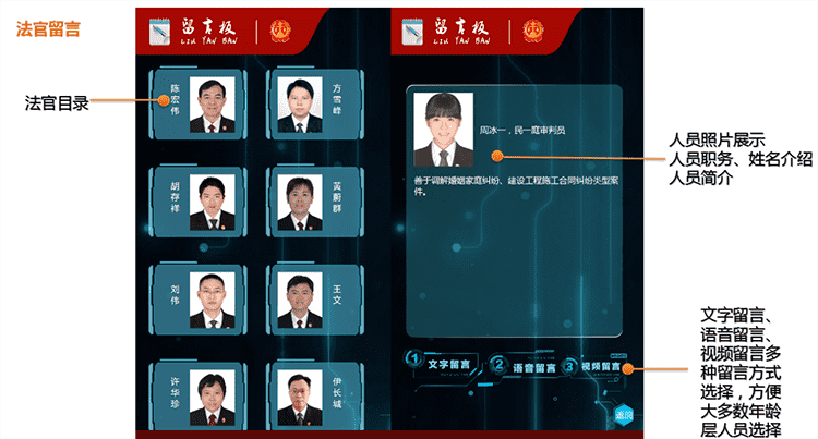 6.法官留言板:当事人在法院内有任何想与法官沟通、投诉或自身诉求需要给法官留言的,可以通过文字留言、语音留言方式给对应法官。