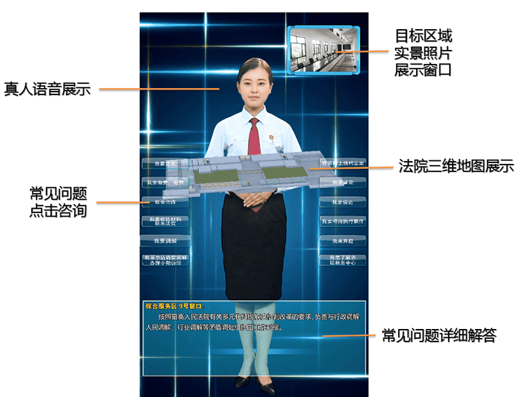 4.导诉功能(需定制):比如:我要立案;屏幕会出现虚拟人导诉员,告知当事人,立案窗口在哪里,立案的注意事项。